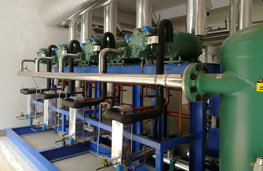 技術(shù)實現(xiàn)形式:制冷系統(tǒng)主機(jī):選用一臺自帶經(jīng)濟(jì)器液氟冷卻螺桿并聯(lián)機(jī)組2*RC2-470,供液方式選擇:泵供液系統(tǒng)選用1臺桶泵機(jī)組ZWF6.0,循環(huán)桶容積6.0立方米,配置2臺屏蔽冷媒泵; 蒸發(fā)式冷凝器:制冷系統(tǒng)選用1臺SZL-1050蒸發(fā)式冷凝器,虹吸罐:系統(tǒng)選用1臺HG0.5,容積500L,用于冷卻冷凍機(jī)油。 冷間內(nèi)蒸發(fā)器的選擇選用水滴形兩翅鋁合金翅片管;沖霜方式:鋁排蒸發(fā)器采用手動熱氟融霜;