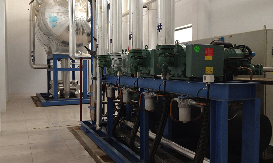 技術(shù)實(shí)現(xiàn)形式:制冷系統(tǒng)冷源采用一套滿液式低溫螺桿并聯(lián)制冷機(jī)組,壓縮機(jī)為德國(guó)比澤爾半封螺桿壓縮機(jī),制冷劑采用 R22, 機(jī)組配一臺(tái)蒸發(fā)式冷凝器,型號(hào)為:SWL-900,供液方式采用桶泵供液,末端蒸發(fā)器采用上下雙翅型鋁排管。